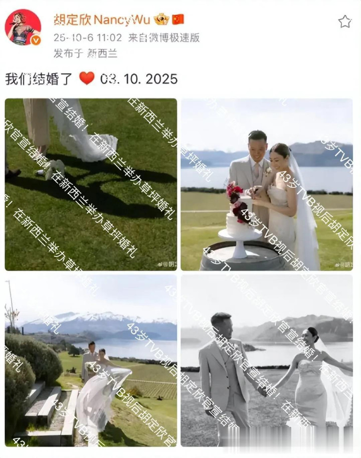 43岁TVB视后胡定欣官宣结婚! 在新西兰举办草坪婚礼, 现场照超美